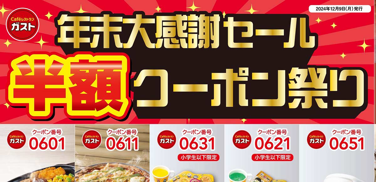 ガスト半額クーポン 年末大感謝祭がすごい! 年始まで安い! GUSTO チーズインハンバーグ、半額祭りじゃない? ピザ ビール・キッズプレートも ガストの年末大感謝祭がはじまっています。ガストの公式Xがポストしていますので、確認してみてください。アプリクーポンもありますが、一覧になっているので圧倒的にこっちのほうが見やすいですね。半額は2024年12月9日月曜〜12月29日日曜までの... 2024.12.11 食いしん坊
